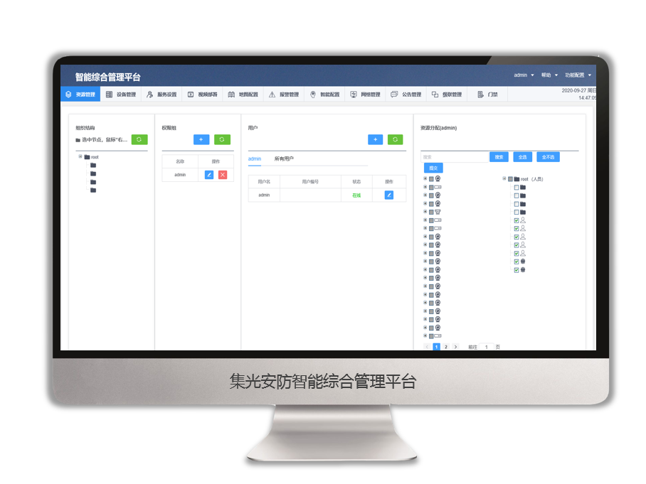 提供安防综合管理平台开放对接支持,用户可灵活部署平台扩展功能,支持资源管理、设备管理、服务设置、视频部署、地图配置、报警管理、智能配置、网络管理、公告管理、级联管理、门禁管理、功能配置、用户管理等功能,以满足更高维度安全防范要求。
